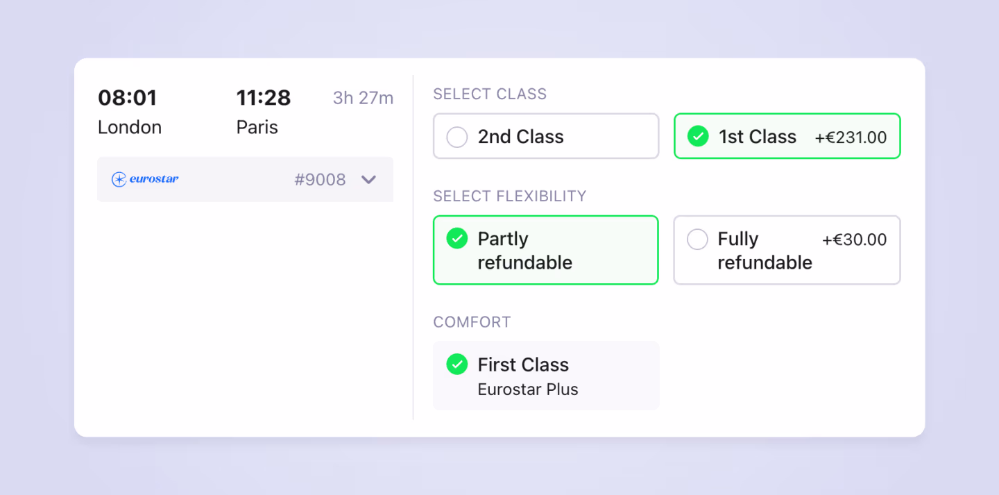 With Embeds, you can implement the core parts needed for selling train tickets in just a few days, without having to do a full API integration. You don’t need to spend time on design or frontend development. Instead, you drop in our embeddable widgets and connect them with your current trip search.